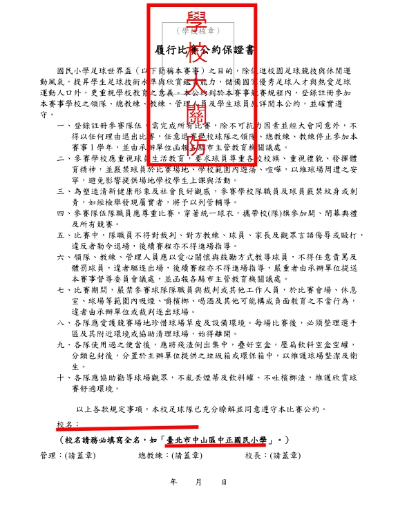 2. 履行比賽公約保證書一份(學校大關防及相關人員職章)