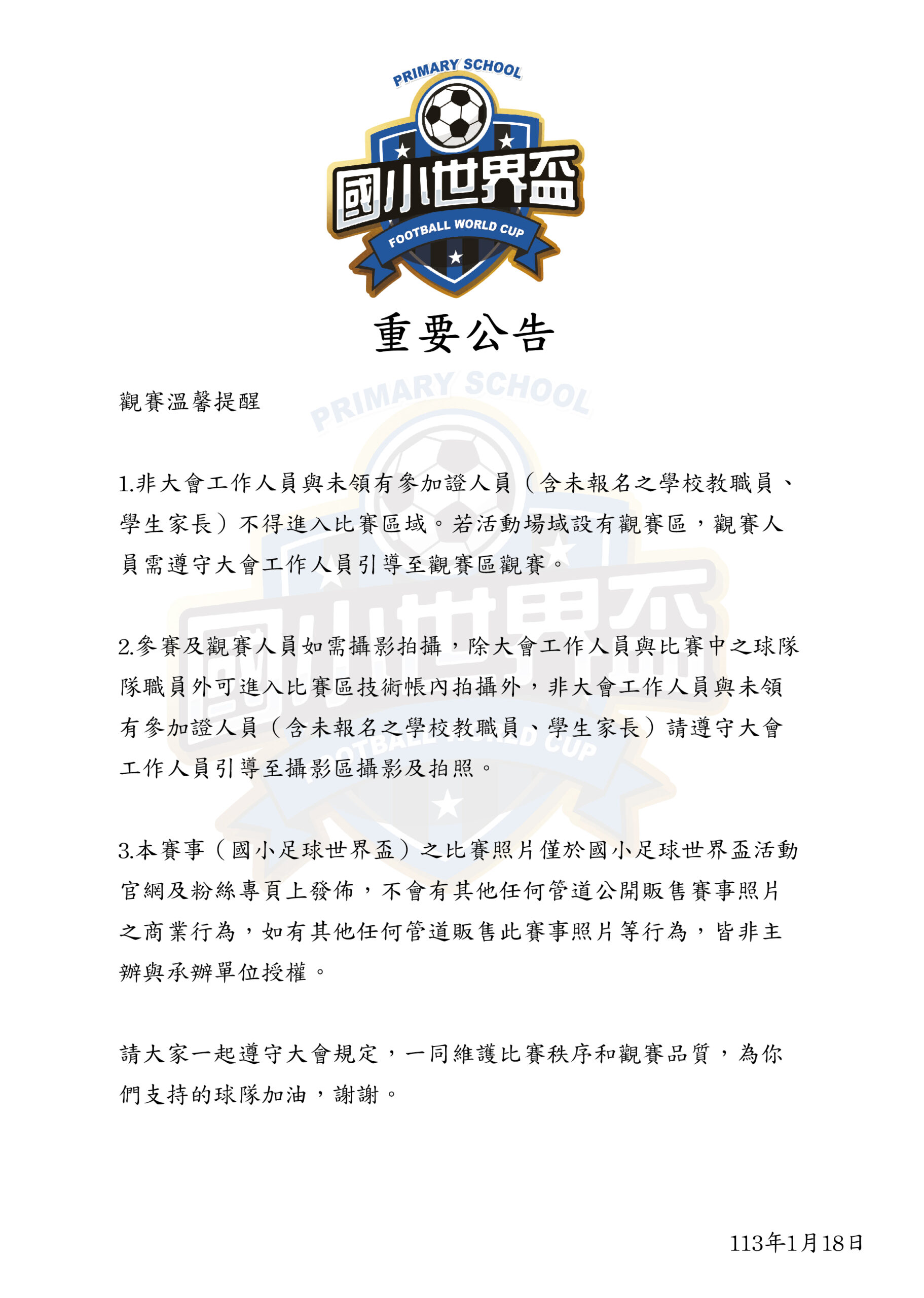 請大家一起遵守大會規定,一同維護每場比賽的秩序和觀賽品質,